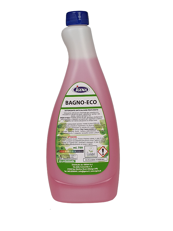 BAGNO ECO: prodotto professionale gradevolmente profumato per la pulizia, l’igienizzazione e la rimozione di calcare da lavelli, rubinetteria, sanitari, box doccia, vasche da bagno. Vedi dettagli